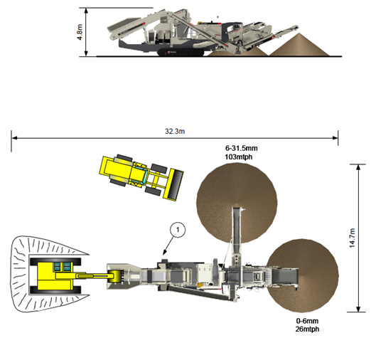 双层分级筛可拆卸,尺寸为3.66m×1.52m,可通过机身再循环输送带将超大物料送回破碎主机。
