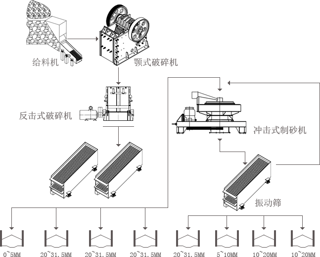 河卵石原料经铲车或自卸车送入原料仓,后经振动给料机均匀的将物料喂入颚式破碎机,将物料破碎至150mm左右大小粒径,通过皮带输送至圆锥破碎机中进行破碎,破碎后的物料经振动筛分级,其中0-5mm的物料通过皮带输送机送至轮斗洗砂机经水洗后送至成品料堆。>30mm的物料由皮带机送至圆锥破碎机再次破碎后由振动筛进行分级,形成闭路循环。5-30mm的物料通过皮带机送至高效离心冲击式制砂机中进行破碎,破碎后的物料经振动筛分级,0-5mm的物料经水洗后送至成品料堆,不符合成品规格的物料再次送至高效离心冲击式制砂机中破碎,形成闭路循环,直至物料符合成品规格后,经水洗后送至成品料堆。